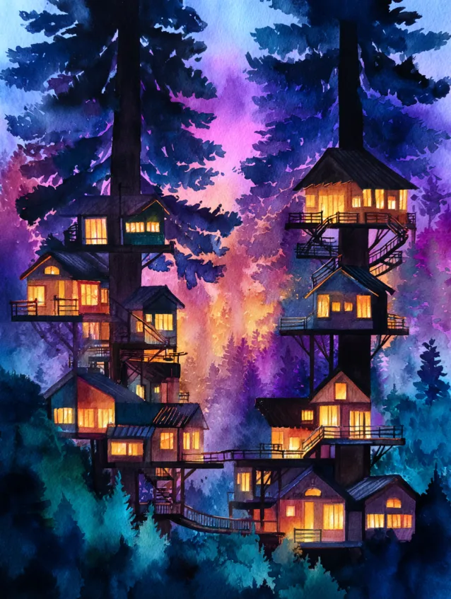This watercolor painting glows with cozy magic. Tall forest trees frame a cluster of treehouses stacked at different heights, each window glowing warm golden light against a dreamy sky washed in purples, pinks, and deep blues. The brush strokes feel soft yet layered, especially in the misty forest below and the glowing sky above. The composition draws your eye upward from the shadowy foliage to the illuminated cabins, creating depth and a storybook atmosphere that feels alive.