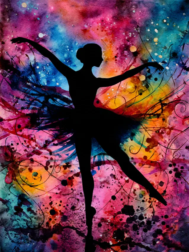 This watercolor painting is bursting with movement and fearless color. A graceful ballerina silhouette stretches across the center, her arms extended as splashes of hot pink, electric blue, sunshine yellow, and fiery orange explode around her. The background feels like layered watercolor galaxies colliding, with drips, splatters, and organic blends creating raw texture and energy. The dark figure contrasts beautifully against the vibrant chaos, making the composition feel bold and dramatic.