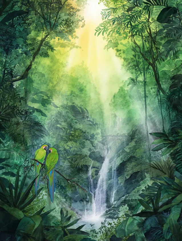 This watercolor scene feels like stepping into a hidden tropical paradise. Layers of rich green foliage frame a delicate waterfall cascading into a misty pool below. Sunlight filters down from above in soft golden beams, cutting through emerald leaves and illuminating the center of the composition. The brushwork creates depth through overlapping plants and subtle gradients, while the water flows in gentle, translucent strokes.