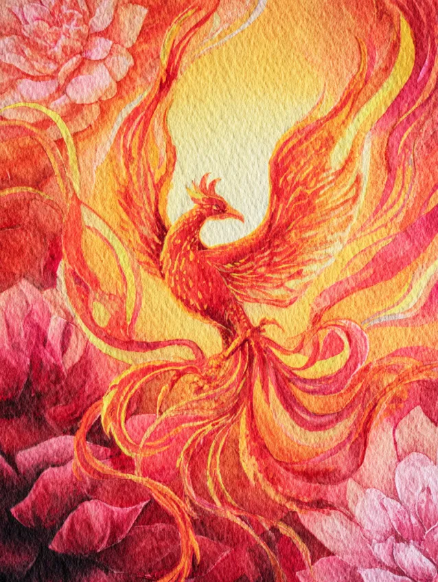 This watercolor design bursts with movement and heat. A majestic phoenix rises upward in swirling shades of orange, coral, and golden yellow, its wings flowing like ribbons of flame. Soft floral shapes in the background echo the curves of the feathers, adding depth and subtle texture. The composition pulls the eye straight up toward the glowing center, where light radiates outward through layered washes.