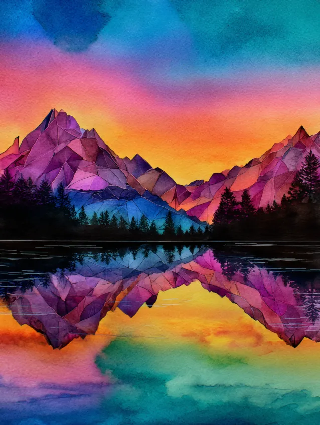 This watercolor landscape is all about color harmony and symmetry. Purple mountain peaks rise beneath a sky that fades from golden yellow to fiery orange and soft teal. The lake below mirrors the entire scene, creating a glassy reflection that doubles the drama. Smooth gradient blends and layered silhouettes give the painting depth while keeping the composition balanced and serene.