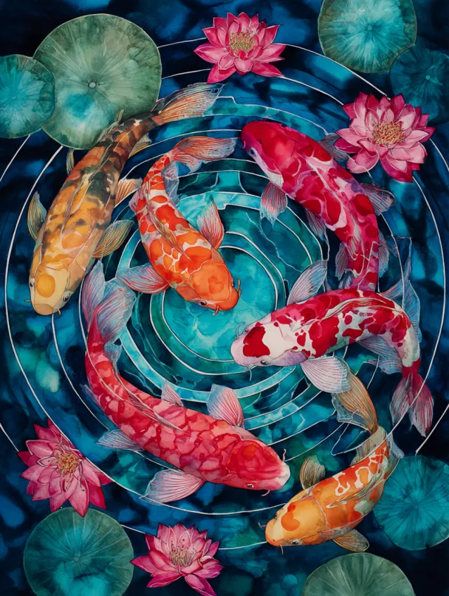 I adore painting koi because the patterns are so playful and expressive. It gives me freedom to experiment with contrast and shape while still keeping the scene soothing. Watching those swirling forms come together feels almost meditative.