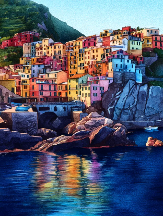 This watercolor scene features a charming seaside village perched along rocky cliffs. Rows of colorful houses in sunny yellows, corals, and soft blues cascade down toward deep sapphire water. Reflections shimmer across the harbor, and layered rocks anchor the foreground with texture and contrast. The composition feels lively yet balanced, full of warm Mediterranean charm.