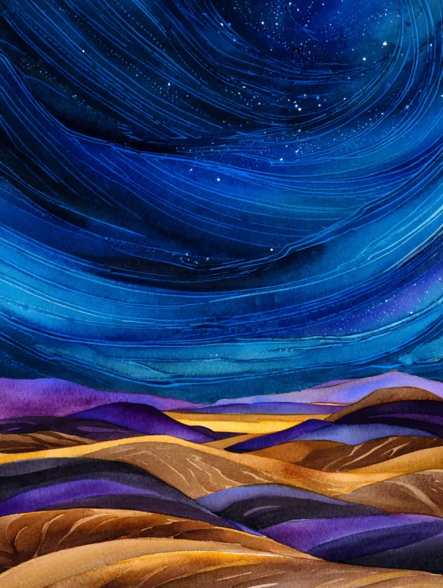 This watercolor artwork captures rolling desert dunes under a sweeping night sky filled with swirling stars. Deep navy and cobalt tones blend smoothly across the sky, while golden sand dunes curve gently in the foreground. The contrast between cool sky and warm earth creates beautiful balance, and soft gradients give the scene a dreamy flow.