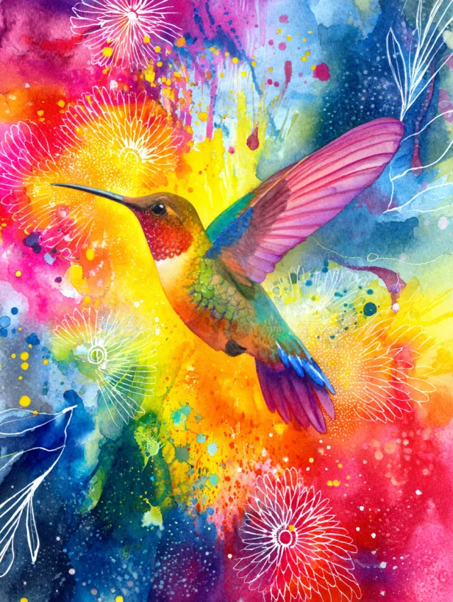 This piece is pure energy. A hummingbird hovers mid air with wings stretched wide, surrounded by explosive splashes of neon pink, electric yellow, turquoise, and fiery orange. The background feels almost like fireworks made of watercolor, with organic bleeds and paint splatters blending into one another. The bird itself is detailed but still soft around the edges, giving the whole composition a vibrant, fluid movement.