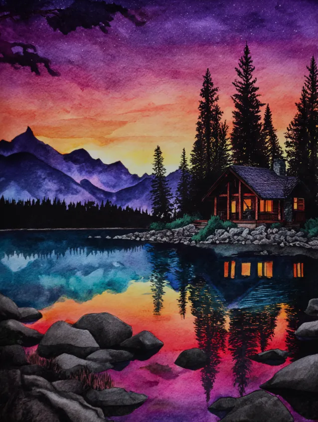 I honestly never get tired of painting cabins like this. There is something so comforting about those warm window lights against a cool mountain evening. I love blending bold sunset colors and then watching them reflect across the water. It feels cozy, a little romantic, and incredibly satisfying when the reflections start to come together. This is one of those scenes that makes me want to paint slowly and savor every layer.