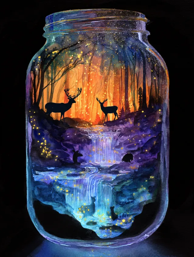 This watercolor design feels whimsical and slightly surreal. A glass jar takes center stage, and inside it sits a tiny forest at sunset with silhouetted deer and a glowing sky that melts into purples and golds. The lower part of the jar transforms into cool blue tones that resemble water or reflections, creating layered depth within the glass. The dark background makes the jar glow even more dramatically.