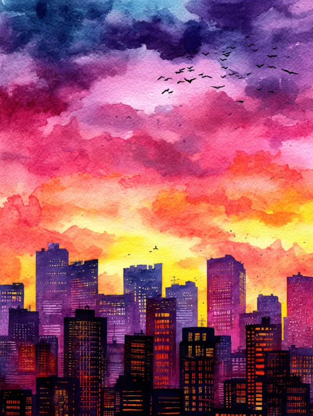 This watercolor skyline bursts with color from top to bottom. The sky shifts from fiery orange and golden yellow near the horizon to magenta and violet higher up, while bold building silhouettes anchor the lower portion of the composition. The windows glow softly, adding warmth and tiny details against the dramatic sky. The gradient blending in the clouds gives the whole piece a dreamy, cinematic vibe.