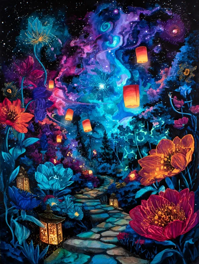 Lantern Lit Garden Under a Starry Sky