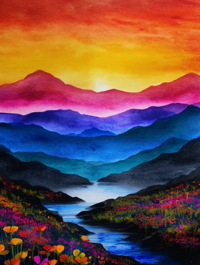 This watercolor landscape features soft, stacked mountain ranges fading from deep indigo to warm pink and golden yellow near the rising sun. A river winds through the center, reflecting the sky’s gradient tones and leading the eye into the distance. Wildflowers in the foreground add texture and vibrant pops of color, creating beautiful depth from front to back.