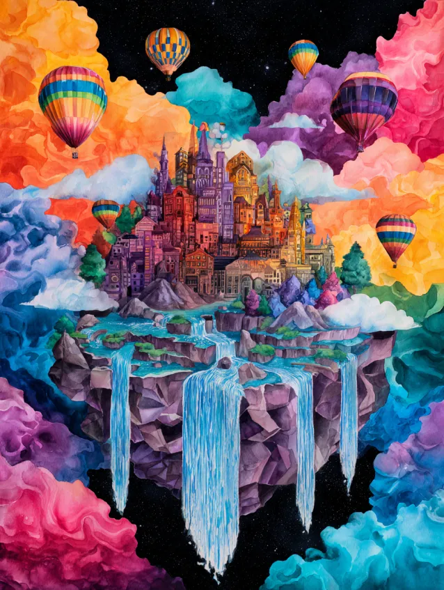 This dreamy watercolor scene shows a fantasy castle perched on a floating island surrounded by cotton candy clouds. Waterfalls spill dramatically from the island into the sky below, while hot air balloons drift through pastel pinks, blues, and golden light. The composition feels vertical and grand, pulling the eye upward toward the castle towers.