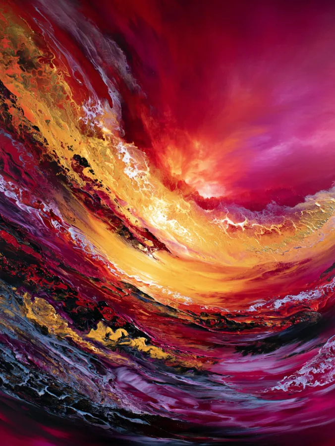 This dramatic large canvas acrylic painting bursts with sweeping motion and glowing color. Layers of crimson, magenta, and deep ruby swirl across the canvas like a powerful wave of energy. At the center, molten gold and warm amber tones glow brightly, creating a radiant focal point that feels almost like a blazing sunrise breaking through a storm of color. Thick, expressive brush strokes twist and flow through the composition, with touches of white foam like texture that add contrast and movement. The entire surface feels alive with motion as rich reds and dark shadows sweep around the golden center, creating a bold, high impact artwork that instantly commands attention on a statement wall.