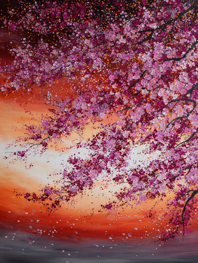 Painting something like this always feels joyful and relaxing to me. I love building the blossoms little by little because it feels like sprinkling color across the canvas. The dot style brush strokes make the process playful and forgiving, which keeps the painting light and fun. The warm sunset background adds that dramatic glow that makes the flowers stand out beautifully. It is the kind of painting that feels peaceful to create and looks stunning once it fills a big wall with color.