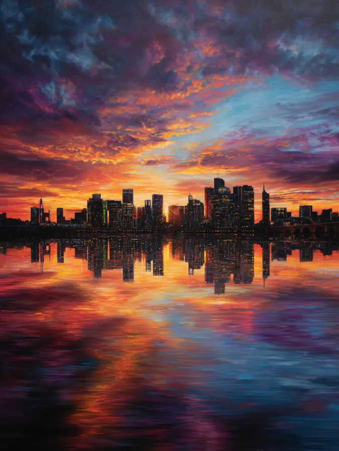 I always enjoy painting city scenes like this because the contrast between nature and architecture feels so striking. The skyline itself is surprisingly simple to block in, which leaves plenty of time to play with the dramatic sky. Blending sunset colors across a wide canvas is incredibly satisfying because the clouds slowly build that glowing atmosphere. The reflection in the water is also really fun to paint since it adds movement and makes the whole scene feel bigger. It is one of those paintings that instantly gives a room that bold modern city vibe.