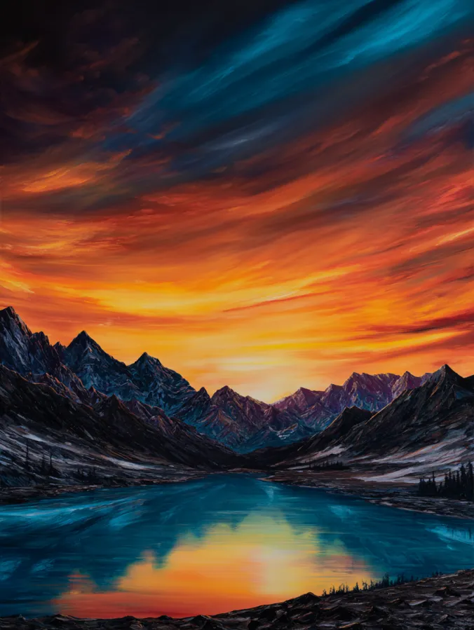 This large canvas acrylic painting captures a dramatic mountain valley glowing beneath a fiery sunset sky. Jagged mountain peaks frame the scene on both sides and lead the eye toward the center where a calm turquoise lake reflects the blazing colors above. The sky steals the show with sweeping brush strokes of orange, amber, crimson, and deep teal blending across the horizon. Soft clouds stretch across the sky like ribbons of light, while the cool blue water mirrors the sunset glow in gentle ripples. The contrast between the warm sky and the cool lake creates a powerful visual balance that makes the whole painting feel bold and cinematic.