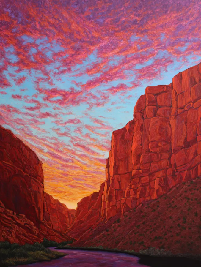 This large canvas acrylic painting captures a dramatic desert canyon glowing beneath a vibrant sunset sky. Towering red rock cliffs rise on both sides of the composition, their textured surfaces painted in warm tones of rust, crimson, and burnt orange. A winding river flows gently through the center of the canyon, reflecting hints of the sky above. Overhead, the sky bursts with sweeping clouds in shades of coral, rose pink, and soft lavender that stretch across a pale blue backdrop. The glowing horizon between the cliffs pulls the eye toward the center and adds a sense of depth and adventure to the scene.