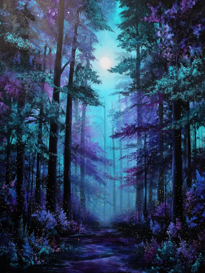 I always find scenes like this incredibly calming to paint. The layered trees give you a nice rhythm as you build the forest step by step. I love blending cool blues and purples because the colors feel peaceful and slightly mysterious. Adding the soft glow of the moon and a few tiny firefly lights makes the painting feel magical without being complicated. It is the kind of artwork that turns a simple forest path into a peaceful nighttime escape.