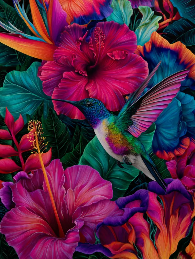 I always find tropical paintings like this incredibly fun to create because the colors can be as bold as you want. I love layering bright pink flowers with deep green leaves since it instantly gives the canvas that lush jungle feel. The hummingbird is such a playful focal point and painting the tiny feathers and wings feels satisfying once the details start to appear. It is the kind of artwork that feels joyful from start to finish and ends up looking like a vibrant little paradise on the wall.