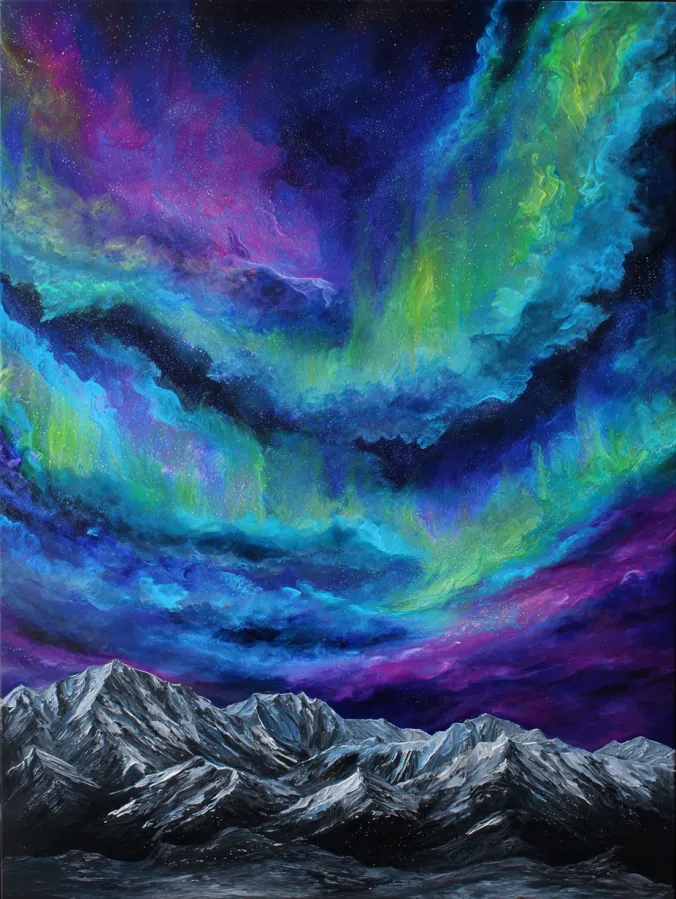 This large canvas acrylic painting captures the breathtaking movement of northern lights sweeping across a star filled night sky. Brilliant ribbons of emerald green, turquoise, violet, and deep blue stretch across the sky like glowing waves of light. Below the sky, jagged snow covered mountains form a cool silvery landscape that anchors the composition. The contrast between the dark sky and the bright aurora creates a dramatic glow that feels almost magical. Soft blended brush strokes shape the flowing lights while subtle stars scatter across the background to complete the nighttime atmosphere.