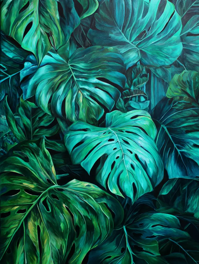 This large canvas acrylic painting is filled with oversized monstera leaves layered across the entire composition. Rich shades of emerald, jade, and deep forest green create a lush tropical atmosphere that feels both bold and calming. Each leaf is painted with soft gradients and gentle highlights that bring out the natural curves and cutout shapes of the foliage. The overlapping leaves build depth across the canvas, while darker shadows tucked between them add drama and contrast. Smooth blended brush strokes give the leaves a velvety texture, while brighter teal accents catch the light and make the whole painting glow with vibrant energy.