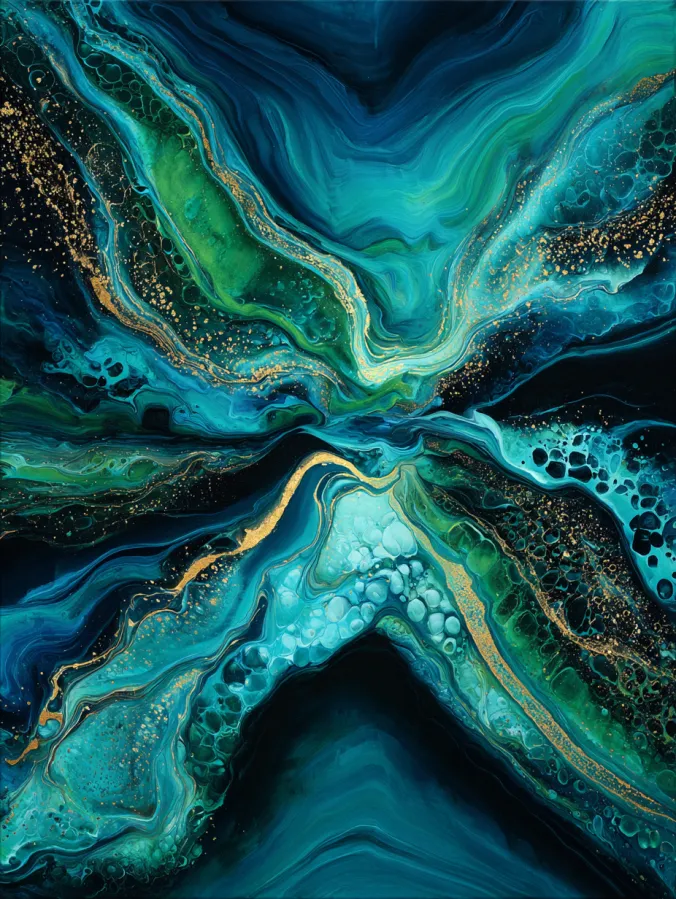 I always find this kind of fluid abstract painting incredibly satisfying to create. The process feels playful and experimental, which makes it perfect for a relaxing painting session. Mixing different shades of green and blue and watching them blend together feels almost magical. The gold accents are my favorite part because they instantly make the painting feel bold and glamorous. It is the kind of artwork that looks complex and dramatic on a wall but still feels fun and approachable to paint.