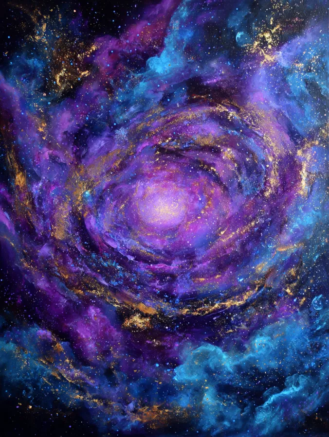 This large canvas acrylic painting captures a glowing spiral galaxy swirling through a dreamy universe of color. Rich layers of violet, indigo, sapphire, and soft lavender twist together around a radiant center that glows with light. Wisps of cloudlike nebula shapes float around the spiral, while tiny star speckles scatter across the dark sky like glitter. Flecks of warm gold shimmer through the galaxy, adding contrast and sparkle against the cool cosmic tones. The brush strokes are soft and flowing, which gives the entire painting a sense of gentle motion as if the galaxy is slowly turning in space.