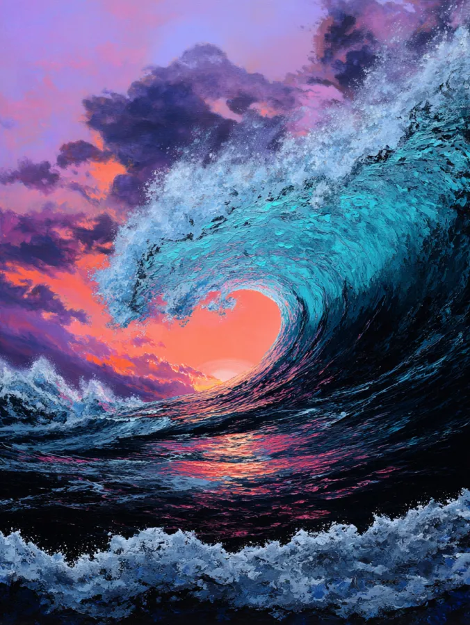 I always find ocean paintings exciting because they let you play with movement and texture. The wave shape gives you a strong guide for the composition, yet the water itself can be painted with loose expressive strokes. I love layering blues and adding those bright foamy highlights because it suddenly makes the wave feel alive. The sunset colors in the sky add a soft contrast that balances the drama of the water. Painting something like this feels bold and satisfying, especially on a big canvas where the wave can really stretch and show off its energy.