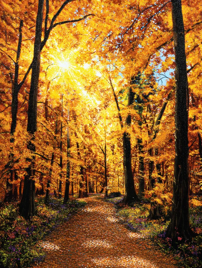 This large canvas acrylic painting captures a glowing autumn forest filled with warm golden light. Tall tree trunks stretch upward while branches burst with rich shades of amber, honey, and burnt orange leaves. Sunlight pours through the canopy and sparkles across the foliage, creating bright highlights that make the entire forest feel radiant. A winding path runs gently through the center of the scene, guiding the eye deeper into the woods. Small touches of purple and green along the forest floor add contrast, while layered brush strokes give the leaves and light a soft shimmering texture.