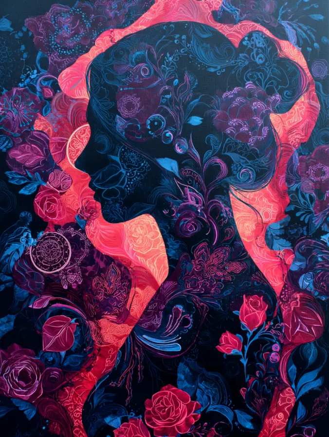 This large canvas acrylic painting features a graceful female profile surrounded by intricate floral patterns and flowing botanical shapes. The silhouette is painted in deep midnight blue with delicate linework and ornamental textures woven throughout the figure. Around the portrait, vibrant roses and curling vines bloom in rich shades of crimson, magenta, and soft coral pink. The glowing coral background outlines the profile and creates a striking contrast against the darker tones. Layered petals, swirling leaves, and decorative patterns fill the canvas, giving the entire composition a lush and slightly dreamy atmosphere.