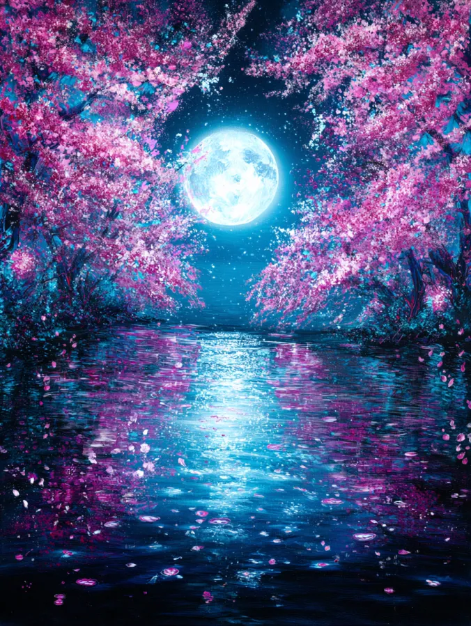 This acrylic painting captures a glowing full moon rising above a calm river framed by lush cherry blossom trees. The blossoms bloom in rich pink and magenta tones that glow against the deep teal night sky. Soft petals drift across the scene and scatter over the water like tiny floating jewels. The river reflects the moonlight in shimmering streaks of turquoise and silver which pull the eye toward the bright center of the painting. Layered brush strokes create thick clusters of blossoms and gentle ripples across the water which gives the whole scene a dreamy sense of depth and movement.