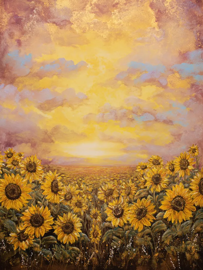 I always find sunflower scenes joyful to paint because the colors feel warm and uplifting from the very first brush stroke. Building the rows of flowers is surprisingly relaxing since each one can have its own little shape and personality. I like slowly layering the petals and adding touches of gold that catch the light. The glowing sky ties everything together and gives the whole painting a peaceful end of day mood. It is the kind of artwork that feels bright and calming at the same time.