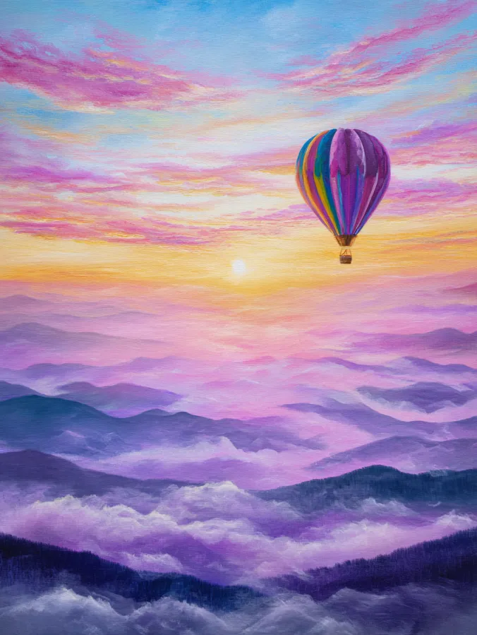 I always enjoy painting sky scenes like this because the colors are so soothing to blend together. Building the layers of mountains and mist feels slow and relaxing like watching the morning fog drift across a valley. The hot air balloon adds a playful little focal point that makes the painting feel adventurous without being complicated. I like taking my time adding the bright stripes and soft highlights on the balloon. It turns the whole scene into a peaceful moment floating quietly above the world.