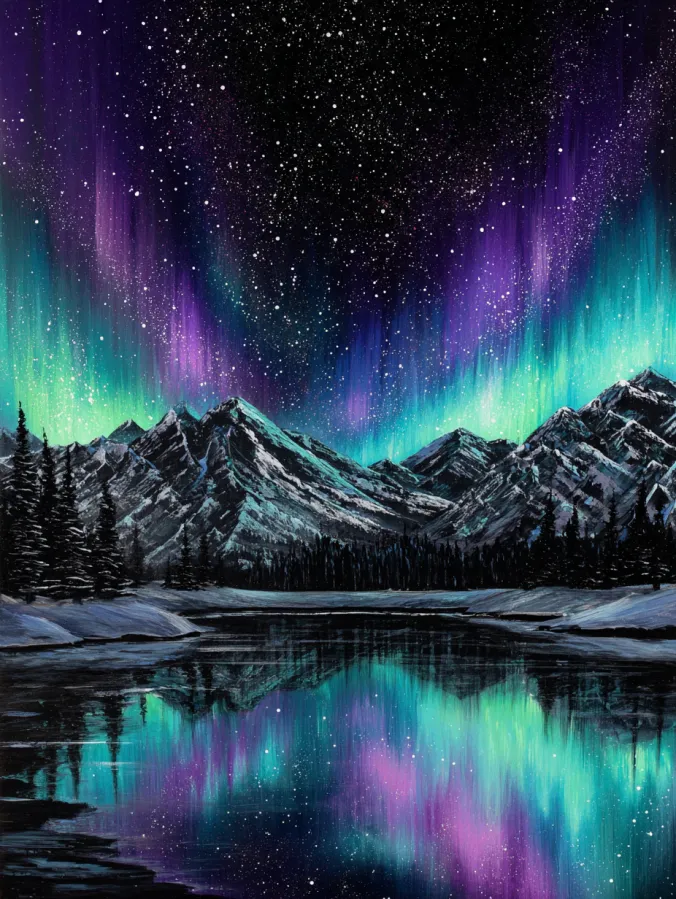 This acrylic painting shows a dramatic night sky glowing with ribbons of northern lights above a peaceful mountain lake. The sky sparkles with countless tiny stars scattered across a deep midnight blue background. Waves of turquoise and violet aurora light stretch across the sky in soft vertical strokes that shimmer above the jagged snow capped mountains. Dark pine trees line the shore and frame the scene while the still lake below reflects the glowing colors of the sky like a mirror. Smooth brush work in the water contrasts with the textured strokes in the mountains and sky which gives the whole painting depth and atmosphere.