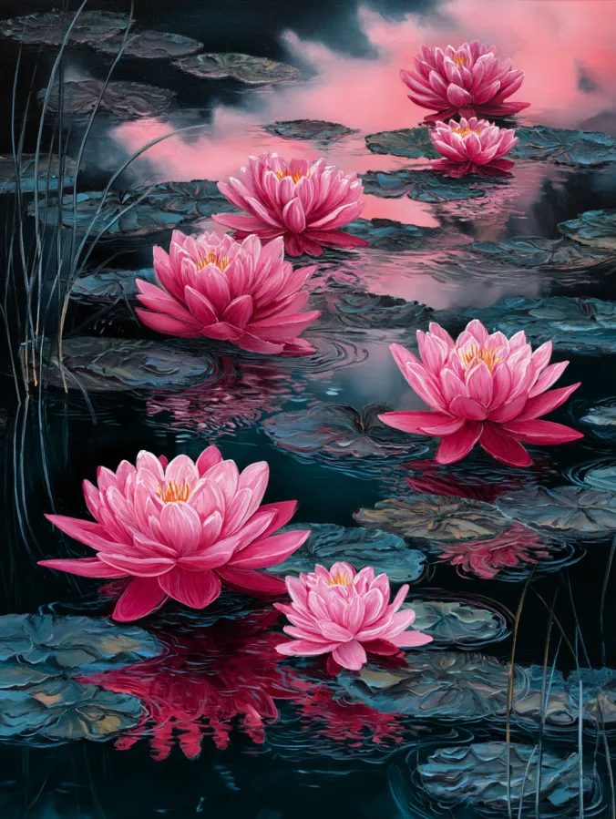 This acrylic painting shows a peaceful pond filled with blooming pink lotus flowers floating across dark calm water. Large blossoms open wide with layered petals in soft shades of rose and coral pink. Lily pads spread gently across the surface in muted greens and deep teal tones which create a beautiful contrast with the bright flowers. The water reflects the blossoms and sky in soft ripples of pink and blue. Delicate brush strokes shape each petal while subtle highlights in the water add movement and depth throughout the scene.