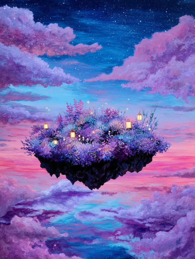 I love painting dreamy scenes like this because it feels like creating a tiny fantasy world on canvas. The sky is so relaxing to blend and you can play with soft color transitions between pink, blue, and purple. Adding the floating island is where the fun really starts. I enjoy layering flowers and tiny lights until the scene feels alive and magical. It is the kind of painting that lets your imagination wander a bit while still being calm and soothing to work on. By the end it feels like you painted your own peaceful little sky garden.