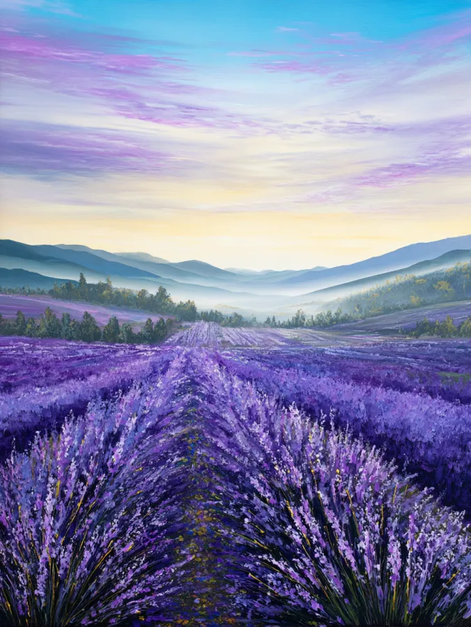 Painting a scene like this always feels incredibly soothing to me. The repeating rows of lavender make the process feel almost rhythmic as you layer small strokes of purple and green across the canvas. I love slowly building the perspective that leads toward the hazy mountains in the distance. The sky is soft and relaxing to blend which balances the textured flowers in the foreground. It is the kind of painting that makes you slow down and enjoy every brush stroke.