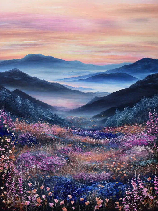This acrylic painting shows a sweeping valley filled with delicate wildflowers that stretch toward distant mountains. The foreground bursts with soft pinks, violets, warm peach tones, and deep blue blossoms layered across the meadow. Loose textured brush strokes give the flowers a lively hand painted look while soft blending creates gentle fields of color between them. Beyond the meadow the landscape fades into rolling blue mountains wrapped in light morning mist. Above the valley a glowing sunrise sky blends peach, coral, and soft lavender clouds that cast a warm dreamy light across the scene.