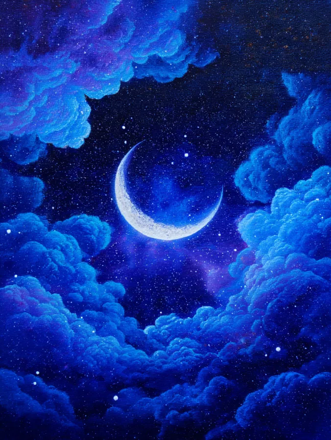 This acrylic painting shows a glowing crescent moon floating in a deep star filled night sky. Rich shades of navy, cobalt, and indigo blend across the background while tiny white stars sparkle throughout the scene. Soft rolling clouds frame the moon from every side and are painted with layered strokes of blue and pale turquoise. The clouds curve inward which gently guides the eye toward the bright crescent in the center. Subtle highlights along the moon and the tops of the clouds create a soft glow that makes the whole sky feel peaceful and luminous.