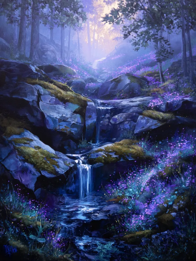 Painting a scene like this feels incredibly peaceful to me because it almost feels like stepping into a quiet forest hideaway. I enjoy building the layers of rocks and slowly adding the glowing flowers across the ground. The waterfall is especially relaxing to paint since the strokes are soft and fluid. It is the kind of artwork where you can take your time and watch the scene slowly come together. By the end the painting feels calm and magical like a secret place you would love to wander through.