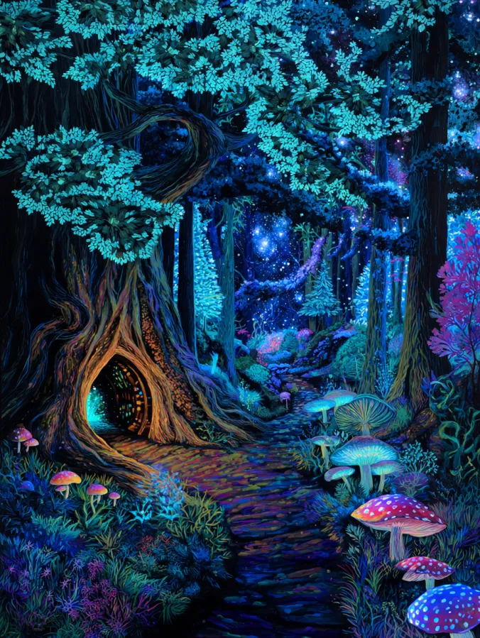 This acrylic painting captures a glowing fantasy forest that feels alive with magic. A winding woodland path leads through towering trees painted in deep indigo and midnight blues. The leaves shimmer in cool turquoise tones that glow softly against the dark forest canopy. At the base of a large twisting tree sits a tiny hollow that looks like a secret fairy home with warm golden light glowing inside. Bright mushrooms in pink, teal, and lavender scatter along the forest floor, adding playful pops of color. In the distance the forest opens toward a dreamy star filled sky that sparkles through the branches. The brushwork feels textured and rich, especially in the bark of the trees and the leafy canopy above. Everything layers beautifully from the glowing mushrooms in the foreground to the mysterious starry woods in the background.