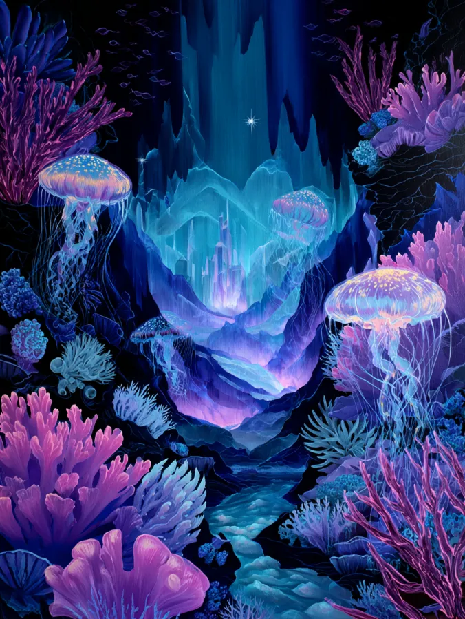 I absolutely love the calming mood of a painting like this. The flowing jellyfish shapes would be so relaxing to paint because their soft curves naturally guide the brush. Blending those glowing ocean colors would feel like painting light underwater. The coral details also add a playful creative moment where you can experiment with color and texture. For me this kind of scene feels peaceful and magical at the same time. It almost feels like painting a quiet hidden world far below the ocean where everything glows softly in the dark.