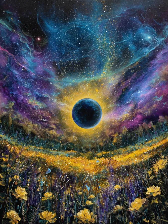 This acrylic painting shows a breathtaking night sky glowing above a dreamy field of golden wildflowers. A dark planet sits at the center of the sky surrounded by a halo of warm golden light that radiates across swirling galaxies. The sky itself is filled with rich blues, purples, and hints of teal that blend together like a cosmic watercolor wash. Tiny stars scatter across the canvas in soft speckles of white and gold. Below the sky stretches a glowing meadow filled with delicate yellow flowers and tall grasses that shimmer with warm light. The field curves gently across the composition which leads the eye toward a dark forest silhouette resting along the horizon. Loose textured brush strokes bring the flowers to life while soft layered blends give the sky its dreamy glowing depth.