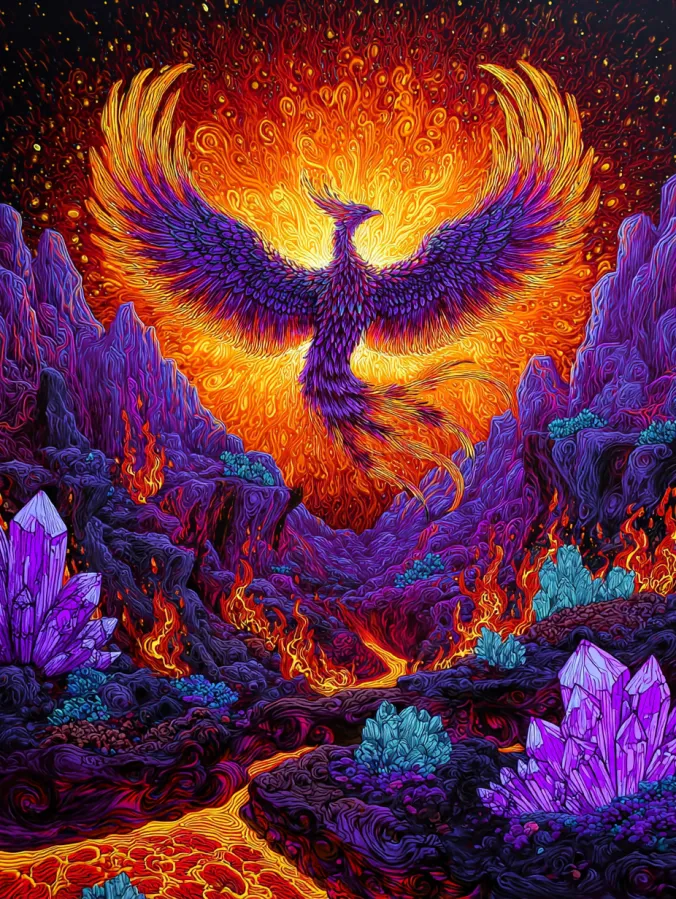 Fiery Phoenix Rising Above A Crystal Lava Valley