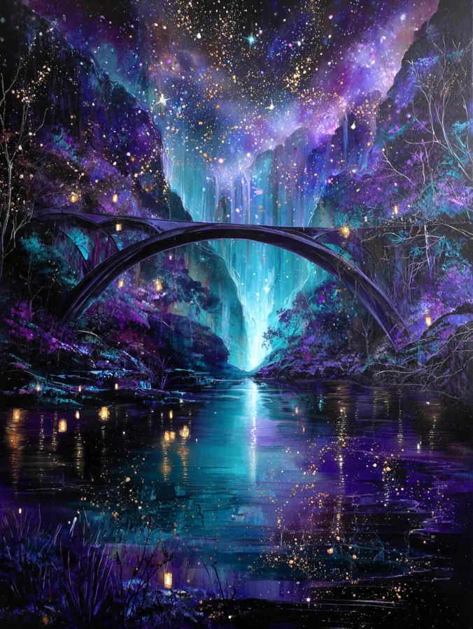 This acrylic painting captures a dreamy fantasy valley glowing under a sky full of sparkling stars. A graceful arched bridge stretches across the middle of the scene, connecting the rocky cliffs on either side of the glowing canyon. Beneath the bridge a soft turquoise waterfall pours down from the distant cliffs and flows into a calm reflective river below. The water mirrors the colors of the sky with deep purples, midnight blues, and glowing hints of teal. Tiny lantern lights float across the surface of the river like scattered fireflies. The surrounding cliffs and trees are painted in rich shades of violet and indigo, giving the landscape a peaceful nighttime glow. Above everything the sky shimmers with countless stars and golden specks that swirl through the air like magical dust.