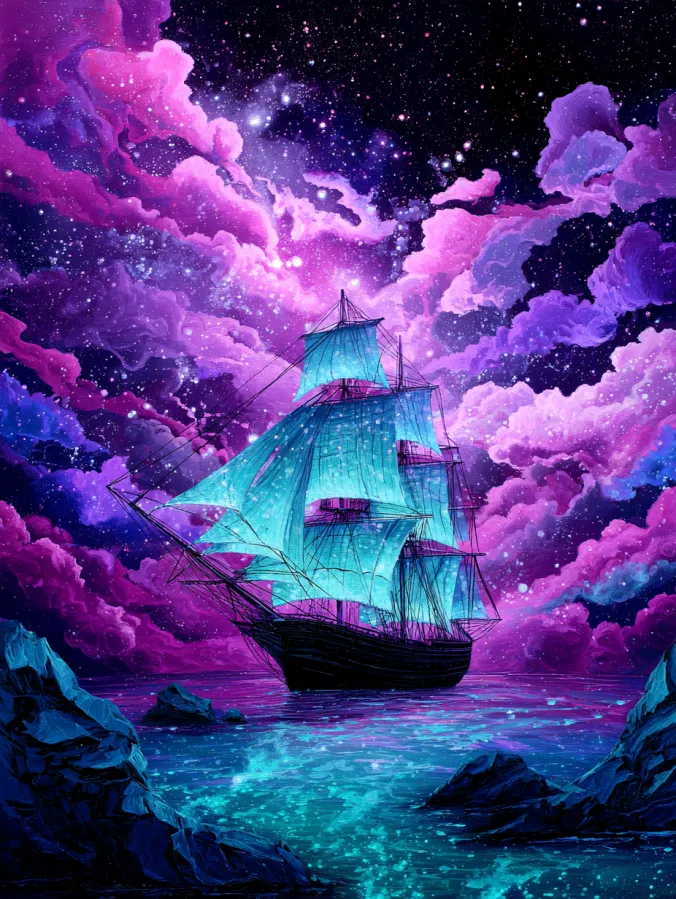 This acrylic painting shows a glowing sailing ship drifting across a calm magical sea under a dazzling galaxy sky. The ship sits at the center with tall sails glowing in soft turquoise light that contrasts beautifully against the deep purple and pink clouds above. The sky feels enormous and full of wonder with swirling nebula colors and thousands of sparkling stars scattered across the dark night. The ocean below reflects those glowing colors with rippling shades of teal, violet, and midnight blue. Dark rocky cliffs frame the edges of the scene which gently guide the eye toward the ship and the glowing horizon. The brushwork blends soft dreamy clouds with shimmering water reflections while the delicate lines of the ship create a graceful focal point.
