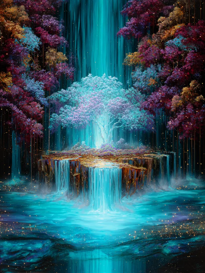 This acrylic painting shows a magical floating island crowned by a luminous tree at the center of a glowing waterfall landscape. The island rests like a small plateau surrounded by streams of bright turquoise water that spill gently over the edges into a glowing pool below. At the top stands a radiant tree with pale lavender and icy blue leaves that shimmer softly under beams of light cascading from above. Tall colorful forest trees frame the scene on both sides with rich tones of magenta, crimson, and deep violet that contrast beautifully with the cool turquoise water. The waterfalls fall in silky vertical ribbons while tiny golden sparkles float throughout the air like drifting stardust. Soft blended brush strokes shape the flowing water while textured layers bring life to the tree canopy and glowing forest colors.