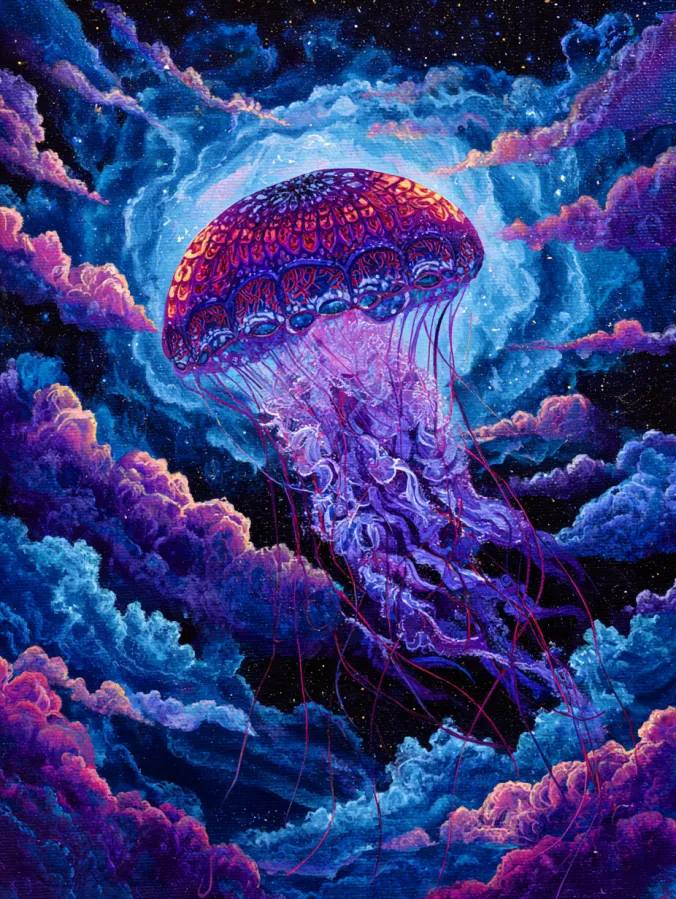 This acrylic painting shows a luminous jellyfish floating gently through a sky filled with glowing clouds and distant stars. The jellyfish sits at the center of the composition with a richly patterned bell in vibrant shades of magenta, violet, and fiery orange. Soft translucent tendrils trail beneath it in delicate flowing lines that shimmer against the darker sky. Surrounding the creature are billowing clouds painted in dreamy blues, purples, and hints of pink that curl across the canvas like waves in the atmosphere. Behind the jellyfish a glowing halo of light opens in the sky which makes the creature appear almost celestial. Tiny stars sparkle through the darker spaces of the sky which adds depth and wonder to the entire scene. The brushwork blends soft cloud textures with intricate details in the jellyfish patterns which gives the painting both movement and elegance.