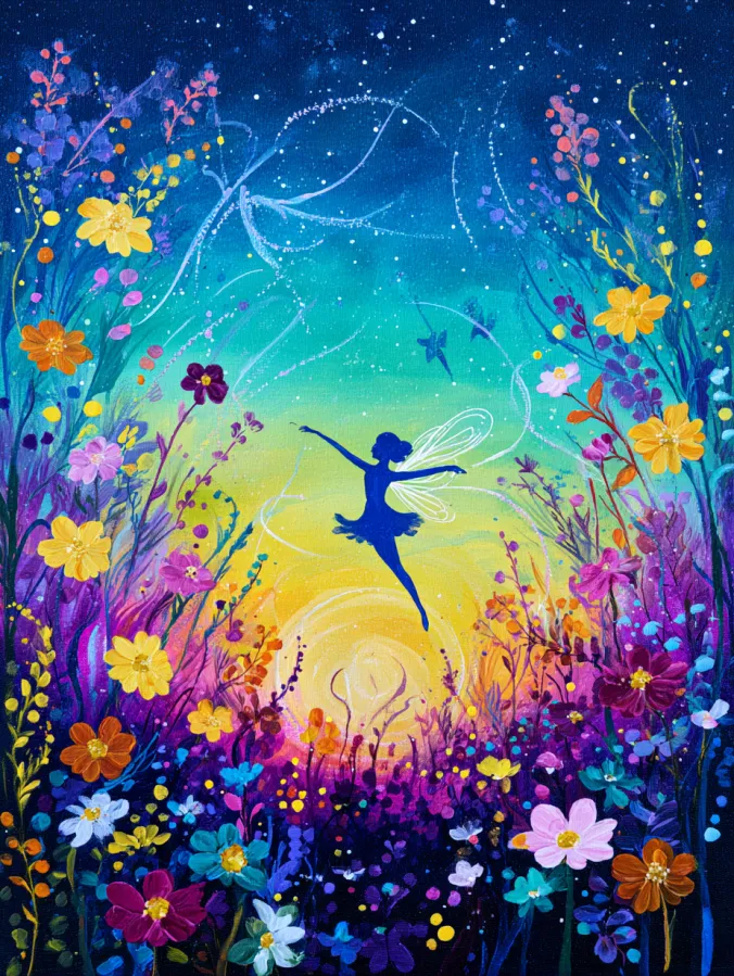 This acrylic painting captures a joyful fairy twirling through a vibrant meadow filled with colorful flowers under a sparkling night sky. At the center a graceful fairy silhouette leaps lightly into the air with delicate wings outlined in soft glowing lines. Around her the meadow bursts with lively blooms in shades of golden yellow, bright pink, violet, and turquoise that stretch upward like a magical garden. The sky fades beautifully from warm golden light near the horizon into cool teal and deep midnight blue filled with tiny glowing stars. Swirling dotted lines dance through the air around the fairy like trails of fairy dust, adding movement and energy to the scene. Loose playful brush strokes give the flowers a lively texture while smooth color blending creates a dreamy glowing sky.