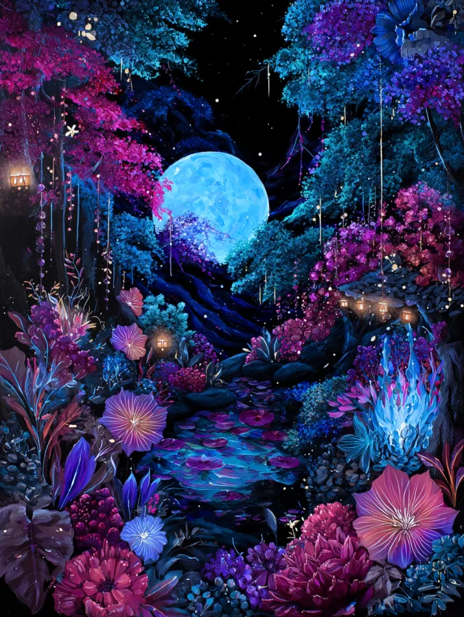 This acrylic painting shows a magical forest garden glowing softly under a large luminous moon. The scene is framed by lush trees and colorful plants in rich shades of sapphire blue, magenta, violet, and teal. A small winding stream flows through the center with lily pads floating on its surface and soft reflections shimmering in the water. Hanging lanterns and tiny glowing lights scatter through the trees which add warm golden highlights against the cool night colors. Large blossoms and leafy plants fill the foreground with layers of vibrant detail while the bright moon glows peacefully in the distance above the forest path. The brushwork mixes soft blended shadows with delicate highlights on the flowers and leaves which gives the whole scene a dreamy glowing atmosphere.