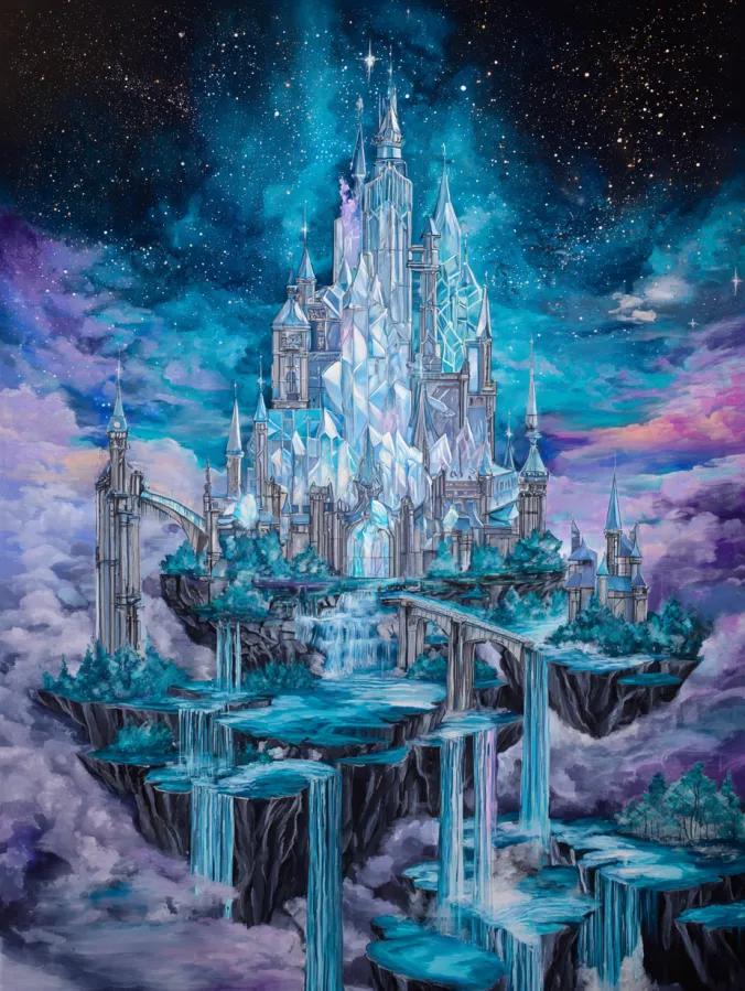 I love a painting like this because it feels like building a whole fantasy world on canvas. The crystal textures are especially fun to paint since you can play with highlights and reflections to make everything sparkle. I would happily spend hours layering blues and silvers to get that icy glow just right. The waterfalls and clouds add such a relaxing rhythm to the composition too. It feels like painting a dreamy fairytale kingdom that floats somewhere far above everyday life, which makes the whole creative process feel wonderfully magical.